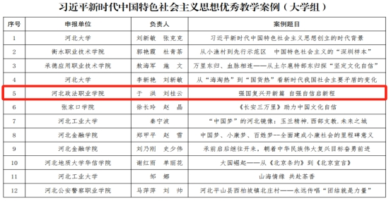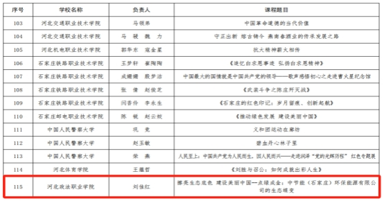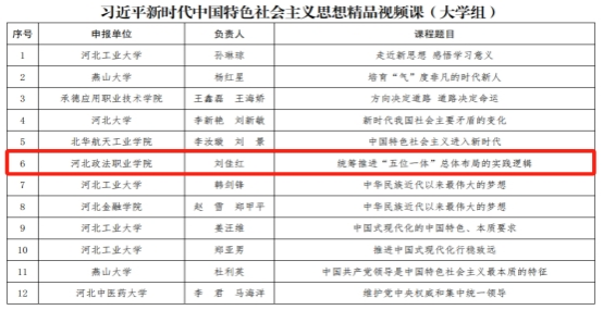 青年思政课教师刘佳红的《擦亮生态底色建设美丽中国--点绿成金:中节能(石家庄)环保能源有限公司的生态蝶变》入选河北省思政课实践教学精品课、《统筹推进“五位一体”总体布局的实践逻辑》入选“习近平新时代中国特色社会主义思想”精品视频课(大学组)。于洪、刘桂云合作打造的教学案例《强国复兴开新篇 自强自信启新程》入选“习近平新时代中国特色社会主义思想”优秀教学案例(大学组)。